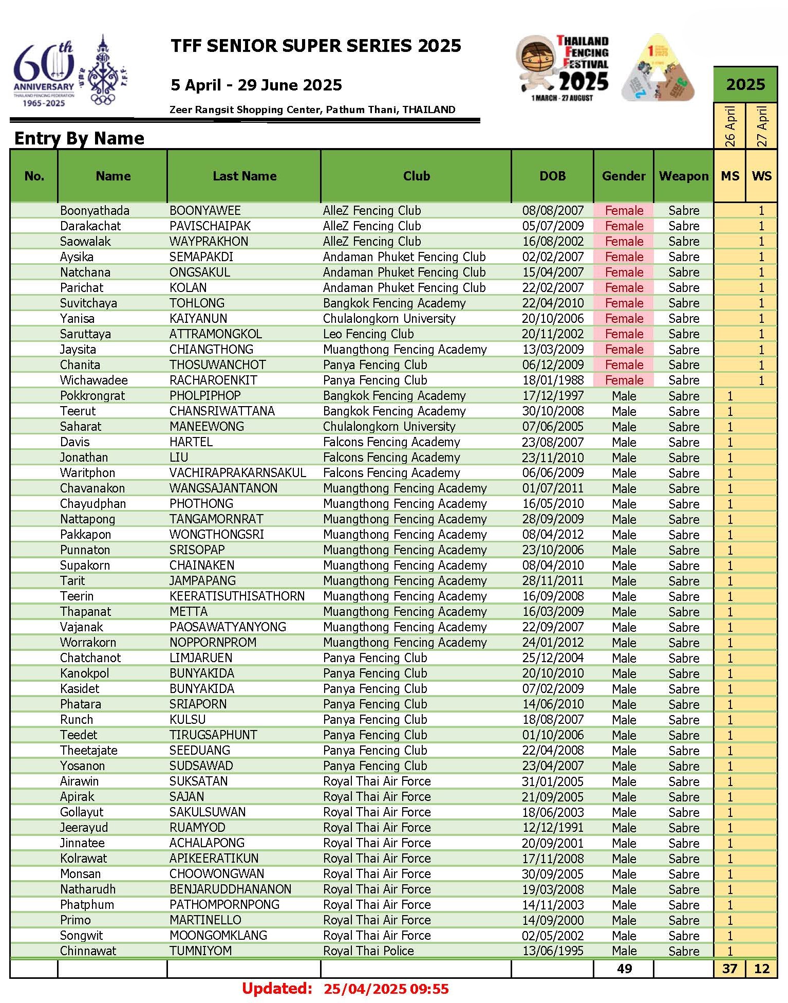 👉26 เมษายน 68 – ประเภทเซเบอร์บุคคลชาย